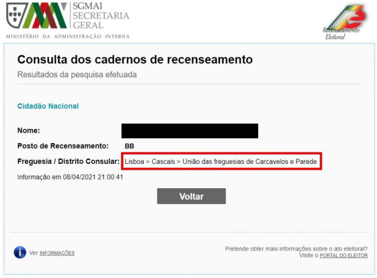 Les citoyens portugais sont automatiquement inscrit à l’endroit associé à l’adresse de leur Cartão de Cidadão. Si dans la recherche ci-dessus le lieu d’inscription n’est pas correct, vous devez changer votre adresse sur la Cartão de Cidadão.